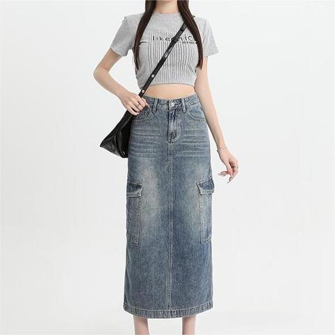 Gonna lunga americana stile retrò Multi-tasca Denim Design snellente stile asimmetrico Casual lavato in difficoltà per l'estate autunnale